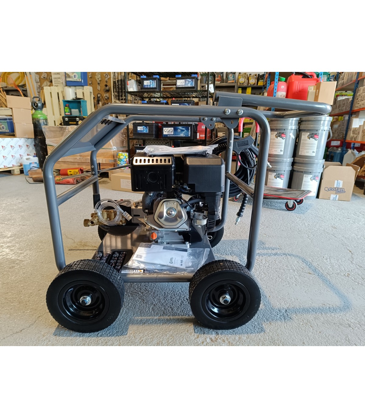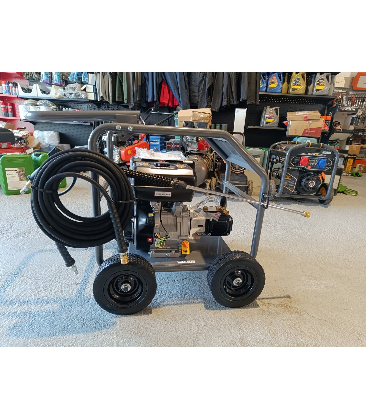 LIMPIADORAS DE AGUA FRÍA con motores de gasolina. 15 m de MANGUERA ALTA PRESIÓN (Manguera con acero trenzado) Fácil transporte. Lanza de 90 cm (36”) con SISTEMA «QUICK CONNECT». Motores 4 tiempos OHV con alarma de aceite. ARRANQUE FÁCIL Y RÁPIDO. Compacto, inyección directa, bajo consumo de combustible. Bomba ANNOVI REVERBERI con cabezal en bronce. Presión máxima 270 bar. BOMBA INDUSTRIAL CON SELLO CERÁMICO y protección térmica. Control de presión por manómetro (Opcional).