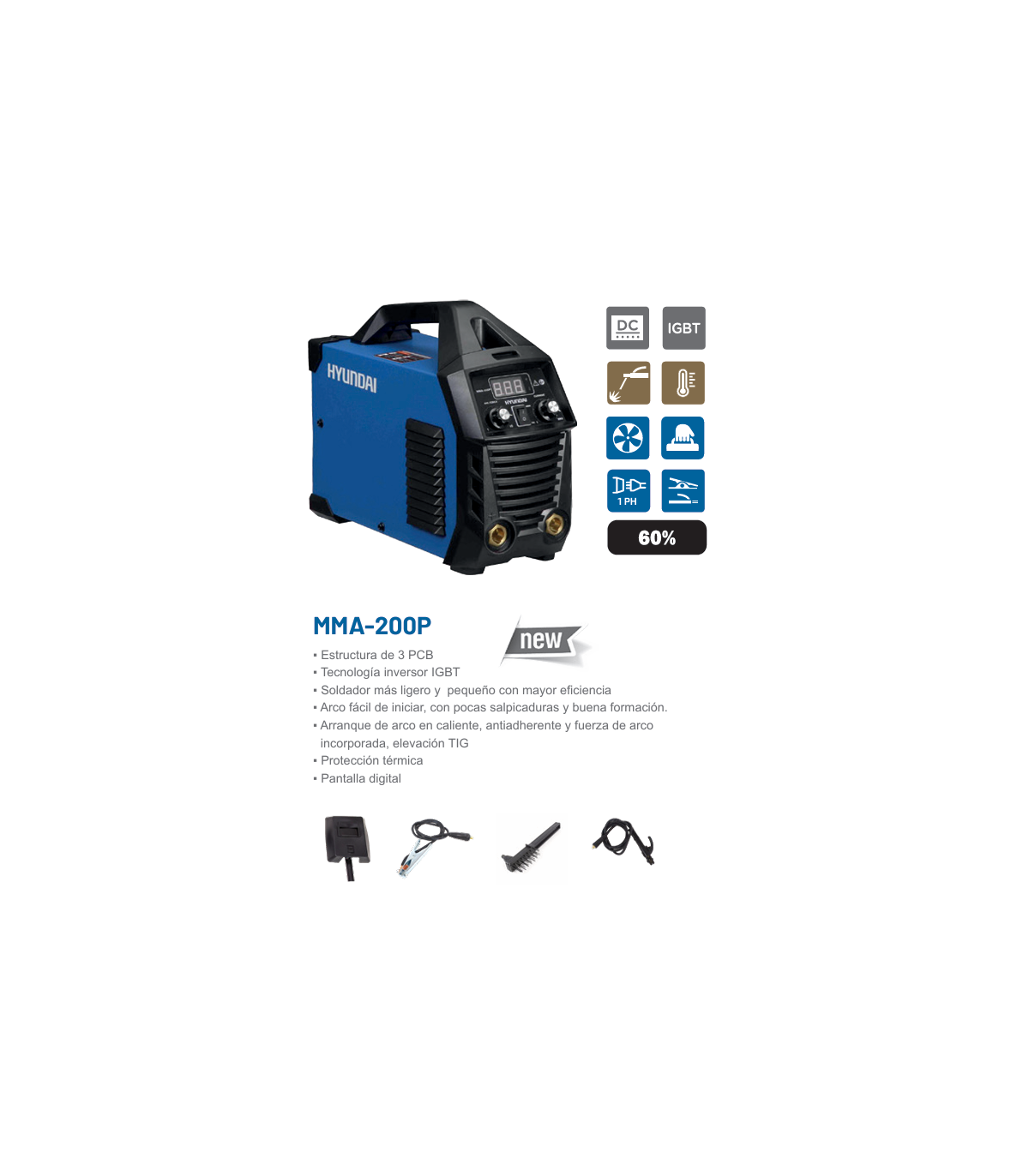 ▪ Estructura de 3 PCB ▪ Tecnología inversor IGBT ▪ Soldador más ligero y pequeño con mayor eficiencia ▪ Arco fácil de iniciar, con pocas salpicaduras y buena formación. ▪ Arranque de arco en caliente, antiadherente y fuerza de arco incorporada, elevación TIG ▪ Protección térmica ▪ Pantalla digital