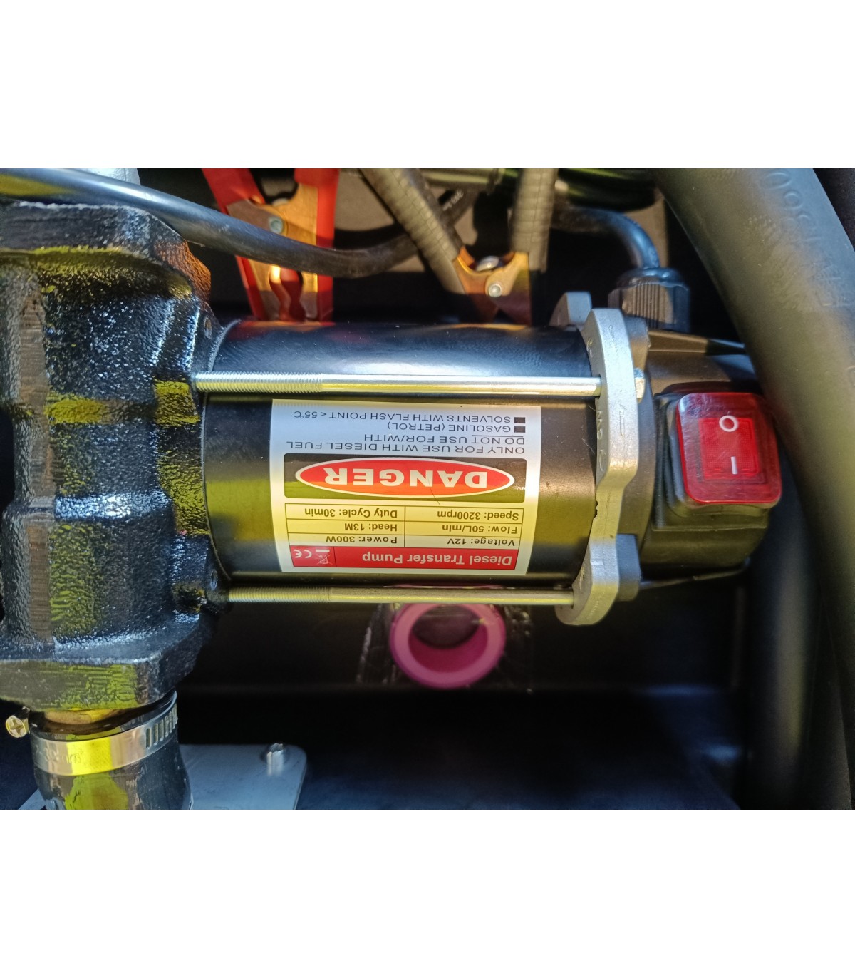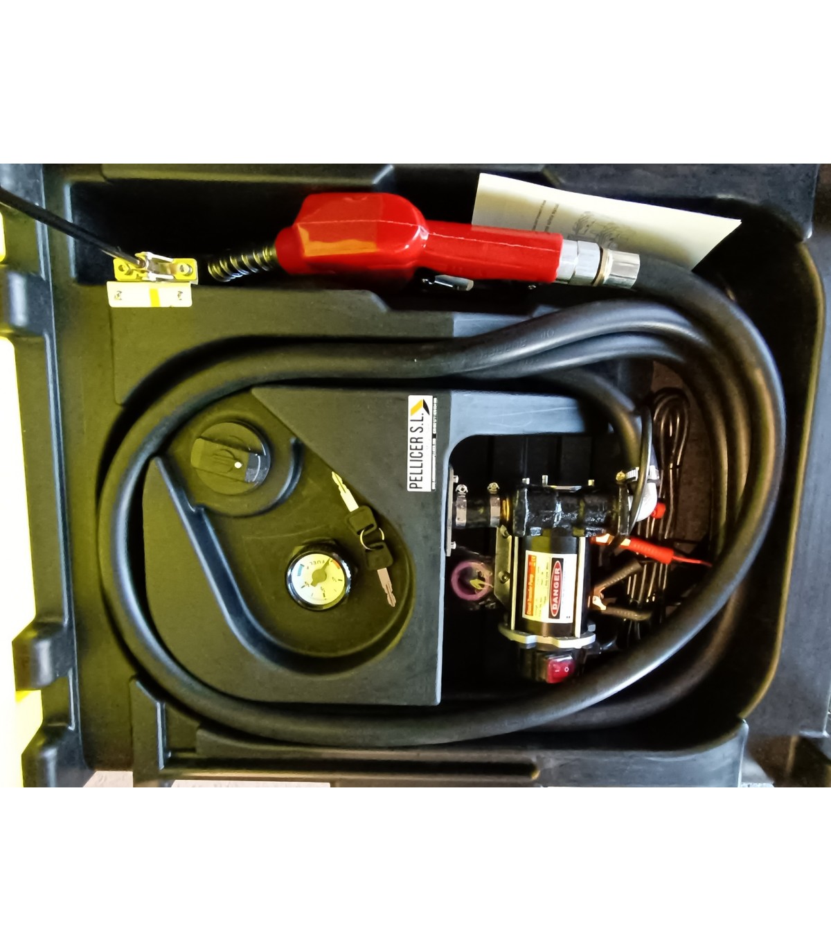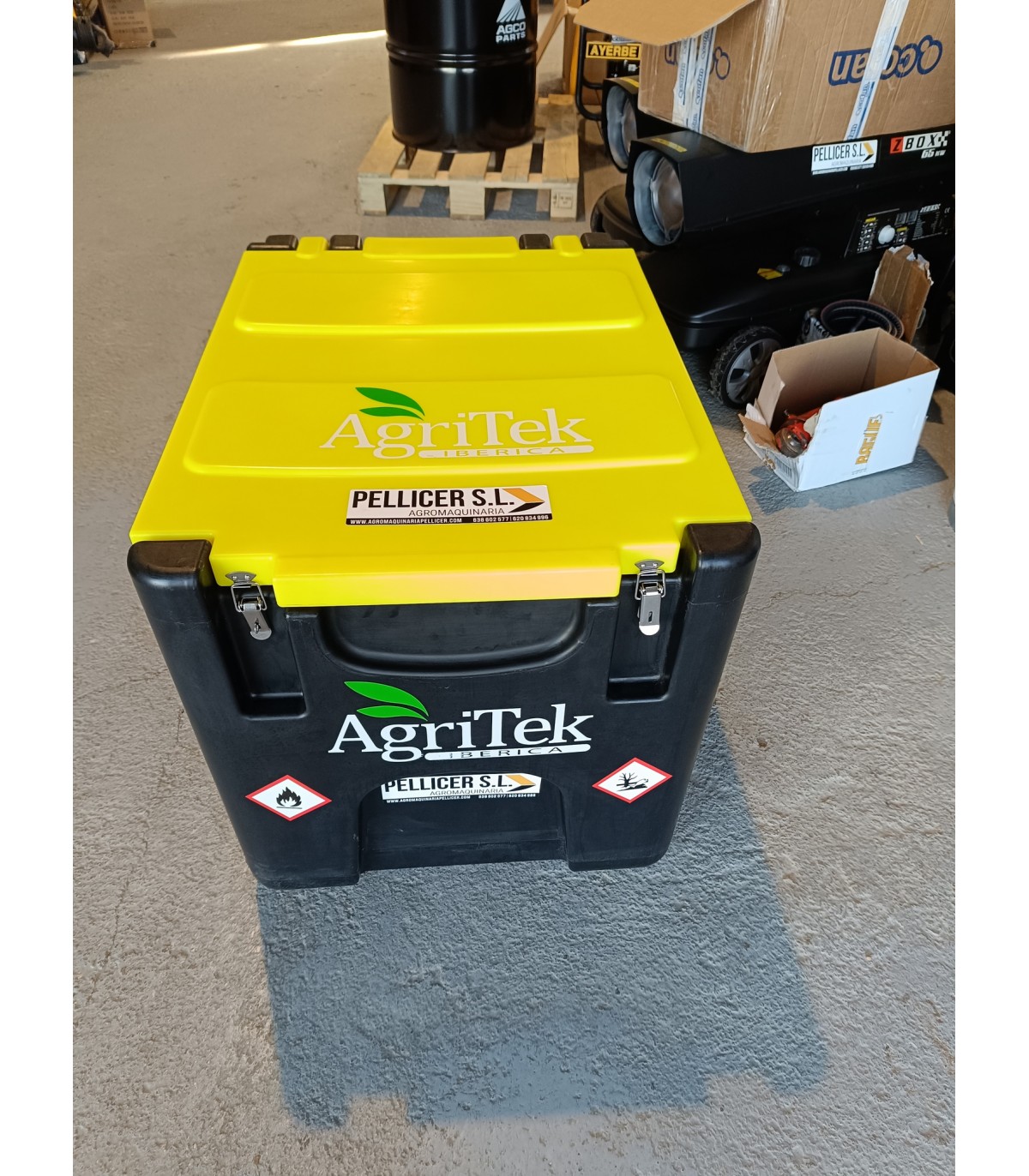 Equipado depósito de la marca AGRITEK, con una capacidad de 200 litros, tapa con bombín incluido, pistola automática con una manguera de 5 metros de longitud, cable con pinzas de 4 metros de longitud, indicador de nivel y llave para cerrar el depósito. Hendiduras integradas en la carcasa del depósito para su traslado con transpaleta.