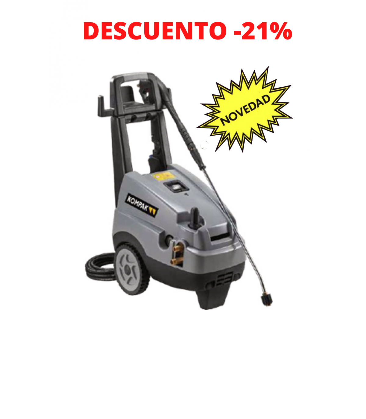 Hidrolavadora KOMPAK equipada con: Motor eléctrico 4 polos (1450 RPM) con protección térmica KP-WE15-66. Motor eléctrico 4 polos (1450 RPM) refrigerado con agua y con protección térmica KP-WE17-78-T. Tres pistones cerámicos KP-WE17-78-T. Total Stop retrasado y en baja tensión KP-WE17-78-T. Aspiración indirecta con depósito de detergente incorporado (2,8 lt.). Regulador de la presión. Manómetro en baño de glicerina. Enrollador manguera.